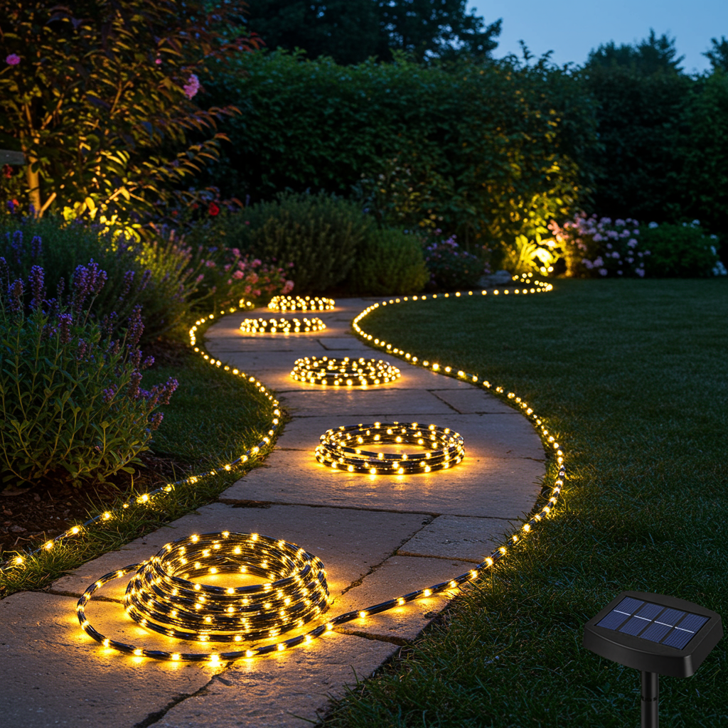 Solar rope lights offer a flexible and durable solution for illuminating garden paths or borders, creating a safe and whimsical atmosphere. Unlike traditional wired path lights, solar rope lights require no electricity or complex installation, making them easy to shape around curves and edges. Their weather-resistant design ensures long-lasting performance in all seasons. Additionally, solar rope lights provide a softer, continuous glow that adds charm and visibility to walkways.